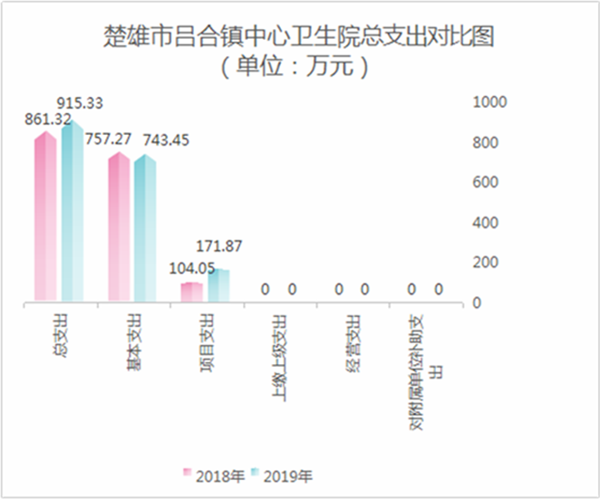 楚雄市吕合镇中心卫生院部门2019年度支出合计915.33万元。其中:基本支出743.45万元,占总支出的81.22%;项目支出171.87万元,占总支出的18.78%;上缴上级支出、经营支出、对附属单位补助支出共0万元,占总支出的0%。