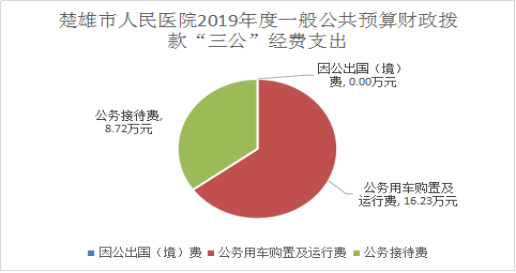 楚雄市人民医院部门2019年度一般公共预算财政拨款“三公”经费支出预算为0万元,支出决算为24.95万元,完成预算的0%。其中:因公出国(境)费支出决算为0万元,完成预算的0%;公务用车购置及运行费支出决算为16.23万元,完成预算的0%;公务接待费支出决算为8.72万元,完成预算的0%。2019年度一般公共预算财政拨款“三公”经费支出决算数大于预算数的主要原因楚雄市人民医院属事业单位,财政按在职在编人员档案工资进行人员经费差额预算,无“三公”经费预算及拨款,所有支出均为单位自筹。