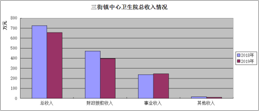 楚雄市三街镇中心卫生院部门2019年度收入合计656.62万元。其中:财政拨款收入396.9万元,占总收入的60.45%;上级补助收入0万元,占总收入的0%;事业收入247.11万元,占总收入的37.63%;经营收入0万元,占总收入的0%;附属单位缴款收入0万元,占总收入的0%;其他收入12.61万元,占总收入的1.92%。与上年收入对比分析:2019年财政收入比上年减少74.4万元,减少了15.78%,减少的主要原因为项目资金-基本公共卫生经费减少;事业收入与上年相比增加了8.46万元,增加了3.54%,增加原因为病人增加,医疗业务收入增加;其他收入与上年相比减少了3.44万元,减少了21.43%,减少原因为上年的其他收入中含利息收入,而2019年度的其他收入中没有此项收入;总收入比上年减少了69.38万元,减少了9.55%,减少的原因主要为财政拨款收入中的项目资金-基本公共卫生资金减少。收入占比分布图如下: