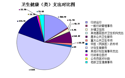 9.卫生健康(类)支出2,517.35万元,占一般公共预算财政拨款总支出的94.7%。其中行政运行支出402.97万元,占卫生健康(类)支出的16.01%;一般行政管理事务支出16.93万元,占卫生健康(类)支出的16.01%;其他基层医疗卫生机构支出6.86万元,占卫生健康(类)支出的0.27%;乡镇卫生院支出45.77万元,占卫生健康(类)支出的1.82%;基本公共卫生服务支出168.07万元,占卫生健康(类)支出的6.68%;重大公共卫生专项支出32.28万元,占卫生健康(类)支出的1.28%;中医(民族医)药专项支出29万元,占卫生健康(类)支出的1.15%;计划生育服务支出1325万元,占卫生健康(类)支出的52.63%;其他计划生育事务支出375.73万元,占卫生健康(类)支出的14.93%;行政单位医疗支出23.92万元,占卫生健康(类)支出的0.95%;公务员医疗补助支出15.14万元,占卫生健康(类)支出的0.6%;老龄卫生健康事务支出75.68万元,占卫生健康(类)支出的3.01%