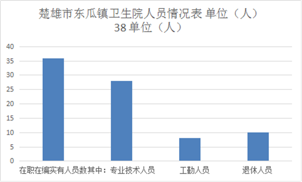 楚雄市东瓜镇卫生院部门2019年末实有人员编制36人。其中:行政编制0人(含行政工勤编制0人),事业编制38人(含参公管理事业编制0人);在职在编实有行政人员0人(含行政工勤人员0人),事业人员36人(含参公管理事业人员0人),其他人员0人。离退休人员0人。其中:离休0人,退休10人。