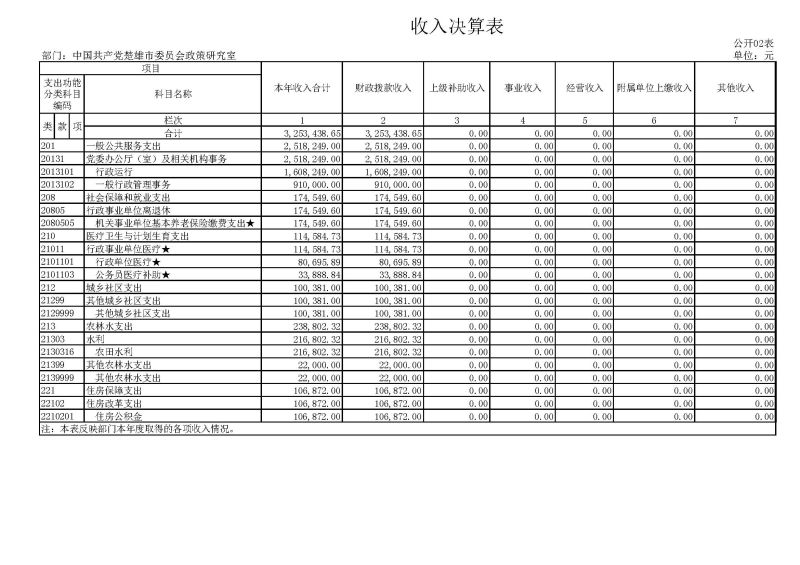 中共楚雄市委政策研究室2017年度收入合计325.34万元。其中:财政拨款收入325.34万元,占总收入的100%;上级补助收入0万元,占总收入的0%;事业收入0万元,占总收入的0%;经营收入0万元,占总收入的0%;附属单位缴款收入0万元,占总收入的0%;其他收入0万元,占总收入的0%。与上年收入783.84万元对比,本年收入减少458.50万元,为上年收入数的41.51%。收入减少的主要原因分析:一是2017年城乡社区支出比2016年减少30万元;二是2016年农林水收入462.6万元,本年收入23.88万元,比2016年减少438.72万元。