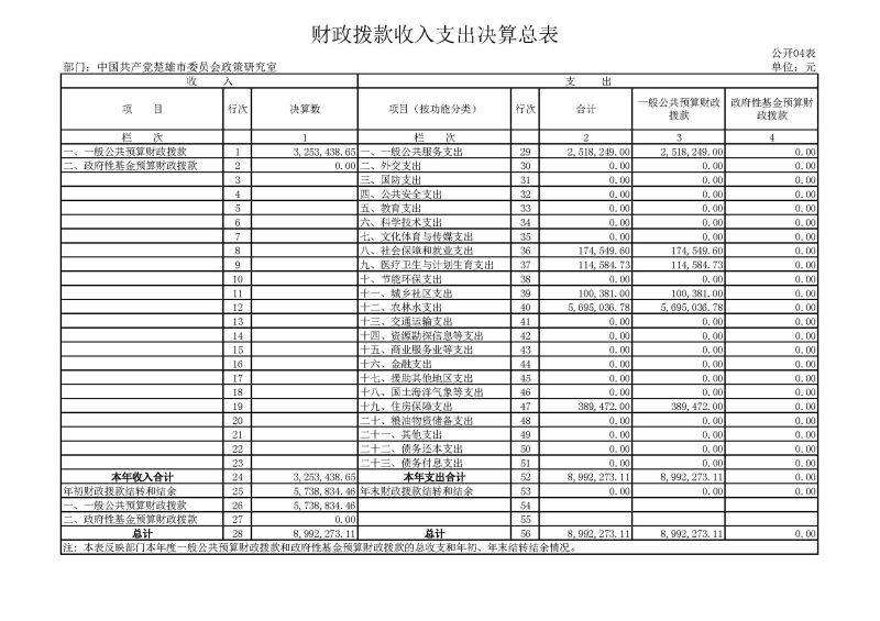 四、财政拨款收入支出决算总表
