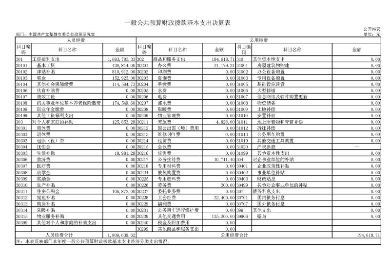 2017年度用于保障中共楚雄市委政策研究室机关、下属事业单位等机构正常运转的日常支出200.43万元。与上年对比支出增加70.94万元。主要原因分析:一是工资及津补贴调整,基本工资、津贴补贴等人员经费支出比上年增加62.97万元;二是人员增加导致支出相应增加, 2016年底新增1名调入人员。包括基本工资、津贴补贴等人员经费支出180.97万元,占基本支出的90.29%;办公费、印刷费、水电费、办公设备购置等日常公用经费19.46万元,占基本支出的9.71%。按在职在岗13人计算,人均人员经费支出13.92万元,人均公用经费支出1.50万元.(人均情况由各部门自行确定)