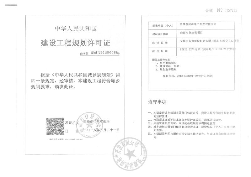 项目简介:楚雄泰恒房地产开发有限公司报审的彝海印象建设项目修建性详细规划,于2018年5月审定实施,其用地位于楚雄市东南新城阳光大道与彝海东路交叉口西侧,规划用地面积18581平方米,规划总建筑面积72823.52平方米,其中地上建筑面积58682.77平方米,地下建筑面积14140.75平方米,建筑密度29.41%,容积率3.31,绿地率35.08%;机动车停车位共423个,其中地上室外停车泊位96个,地上室内停车泊位22个,地下停车泊位305个。2018年5月楚雄泰恒房地产开发有限公司对该项目进行报建,并按程序办理了编号为建字第楚雄市201800088号的《建设工程规划许可证》,总建设规模为72823.52平方米(其中地上58682.77平方米,地下14140.75平方米),许可内容为:高层底商住宅四栋框剪结构地上17层、高层住宅二栋框剪结构地上十七层、商业用房三栋框架结构地上一层、值班室及大门一栋框架结构地上一层、地下室一座框剪结构地下一层。2020年5月楚雄泰恒房地产开发有限公司向我局申请对已竣工建设完成的彝海印象建设项目建设内容进行规划核实验收。经测绘部门实测和现场比对,项目规划建筑密度为29.41%,实测建筑密度为29.59%,高于审定规划0.18%,在允许误差(0.5%)范围内;部分停车位尺寸不符合已审定规划但满足国家标准;项目燃气调压柜位置由规划中的项目地块东北角调整至4#住宅楼东南角,建设方已征得4#楼业主同意且天然气管道已检测合格,经楚雄中石油昆仑燃气有限公司工程管理部证明该燃气调压柜调整后位置满足城镇燃气设计规范相关要求;其余建设符合《建设工程规划许可证》许可内容和已审定规划,其所必须建设的配套设施已按审定的规划建设完成。根据《楚雄州建设工程竣工规划验收管理办法》的规定特进行公示,如对彝海印象建设项目规划核实验收有异议的请在公示期限内与我局联系。