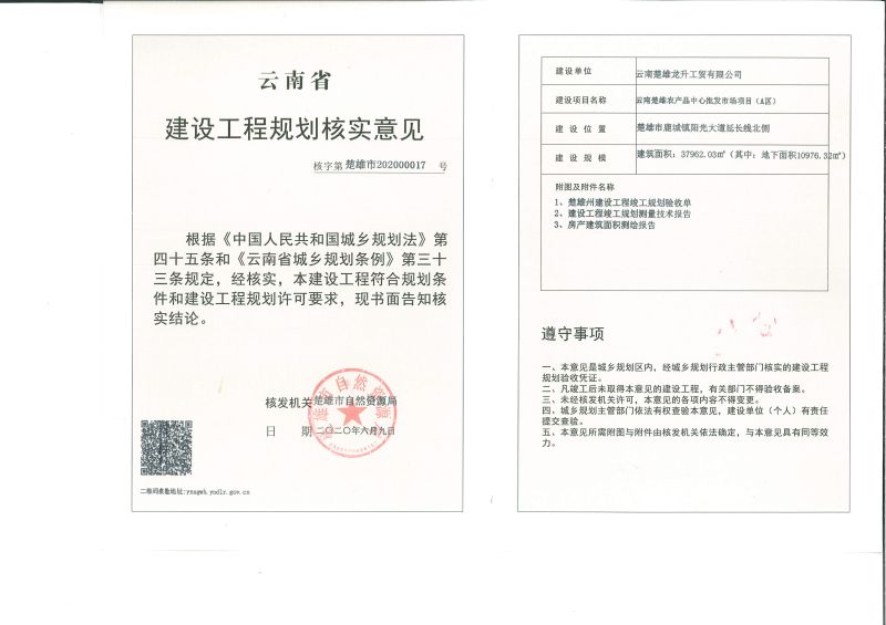 项目简介:云南楚雄农产品中心批发市场项目(A区)用地位于楚雄市鹿城镇阳光大道北侧,彝海东路东侧(玖龙国际二期西侧)。该项目于2020年5月申请规划核实验收,经实测和现场比对,该项目建设符合规划验收相关规定。根据《楚雄州建设工程竣工规划验收管理办法》对该项目于2020年5月21日—2020年5月27日进行公示,公示期间未收到任何意见和建议,2020年6月9日给予规划核实验收。