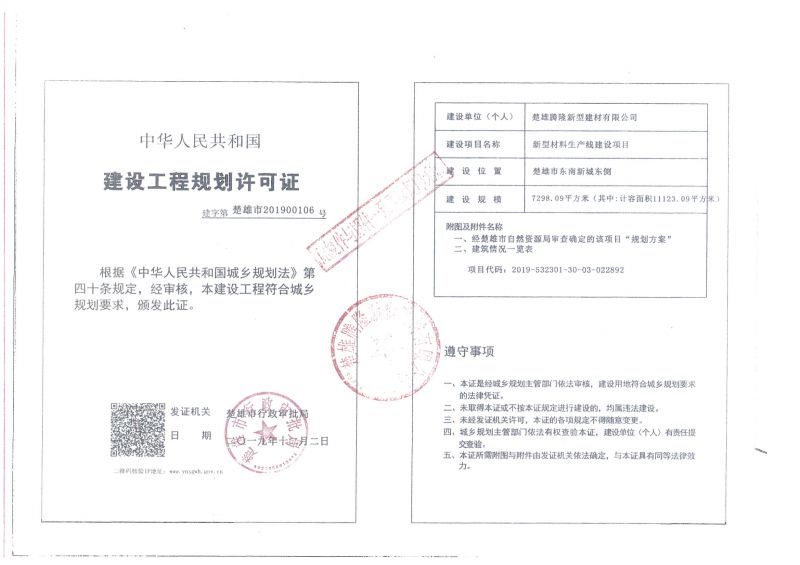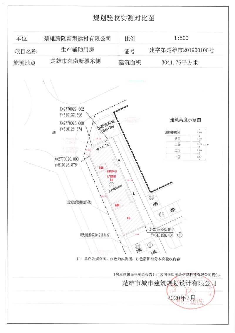 项目简介:楚雄腾隆新型建材有限公司报审的新型材料生产线建设项目修建性详细规划,于2019年11月审定实施,其地块位于楚雄市东南新城东侧(富民工业园区北片区),规划用地面积15819.0平方米,规划总建筑面积7265.69平方米,其中计容积率建筑面积11090.69平方米(含复算建筑面积3825.0平方米),不计容积率面积154.00平方米,建筑密度35.48%,容积率0.701,绿地率5.69%;生产车辆机动车停车位38个,普通机动车停车位24个。2019年12月楚雄腾隆新型建材有限公司对该项目进行报建,并按程序办理了编号为建字第楚雄市201900106号的《建设工程规划许可证》,建设规模为7298.09平方米(其中:计容面积11123.09平方米),许可内容为:生产辅助用房一栋框架结构地上四层、门卫及过磅房一栋砖混结构地上一层、变配电室一栋砖混结构地上一层、污水处理用房一栋钢架结构地上一层、原料库房一栋钢架结构地上一层、机修用房一栋钢架结构地上一层、上料棚一栋钢架结构地上一层。2020年7月楚雄腾隆新型建材有限公司向我局申请对已竣工建设完成的生产辅助用房建设内容进行规划核实验收。经测绘部门实测和现场比对,该生产辅助用房建设符合《建设工程规划许可证》许可内容,拟对其按照单体建筑工程进行规划核实验收。根据《楚雄州建设工程竣工规划验收管理办法》的有关规定特进行公示,如对新型材料生产线建设项目(生产辅助用房)建设内容规划核实验收有异议的请在公示期限内与我局联系。