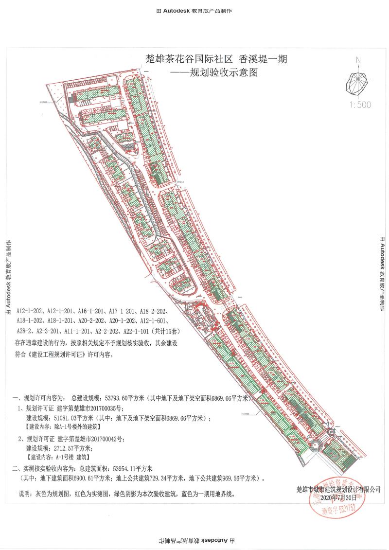 项目简介:楚雄百爵茶花谷房地产开发有限公司报审的楚雄茶花谷国际社区香溪堤一期项目修建性详细规划,于2017年7月审定实施,修改设计方案于2019年8月审定实施,其用地位于楚雄市茶花片区,规划用地面积40295.9平方米,规划总建筑面积54159.46平方米,其中计容积率建筑面积46955.7平方米,不计容积率面积7203.76平方米,建筑密度29.28%,容积率1.17,绿地率33.72%;机动车停车位共381个,其中地面机动车停车位141个,室内机动车停车位240个。2017年该公司对楚雄茶花谷国际社区香溪堤一期进行报建,并按程序分别办理了编号为建字第楚雄市201700035号以及编号为建字第楚雄市201700042号的《建设工程规划许可证》,总建设规模为53793.6平方米(其中地上46923.94平方米,地下及地下架空6869.66平方米),许可内容为:低层住宅七栋框架结构地上3层、多层住宅四栋框剪结构地上5层、多层住宅三栋框剪结构地上6层、底商住宅十一栋框剪结构地上6层(一层设社区用房、监控室、物管用房)、架空层车库一栋框剪结构、配套地下室一栋框剪结构地下1层、商住楼一栋框剪结构地上六层局部三四层(一、二、三层设公厕)。2020年7月楚雄百爵茶花谷房地产开发有限公司向我局申请对已竣工建设完成的楚雄茶花谷国际社区香溪堤一期项目建设内容进行规划核实验收。经测绘单位实测和现场比对,一期项目实测建筑密度28.63%,容积率1.17,绿地率33.86%;机动车停车位共384个,其中地面机动车停车位205个,室内机动车停车位179个;部分建筑即A12-1-202、A12-1-201、A16-1-201、A17-1-201、A18-2-202、A18-1-202、A18-1-201、A20-2-202、A20-1-202、A12-1-601、A28-2、A2-3-201、A11-1-201、A2-2-202、A22-1-101共计15套存在违章建设行为,按照相关规定不予规划核实验收,其余建设符合《建设工程规划许可证》许可内容。根据《楚雄州建设工程竣工规划验收管理办法》的规定特进行公示,如对楚雄茶花谷国际社区香溪堤一期建设内容规划核实验收有异议的请在公示期限内与我局联系。