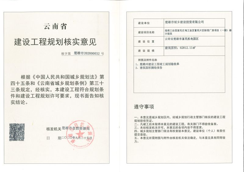 项目简介:楚雄工业园富民庄甸工业区富民片区标准厂房项目(一期)部分建筑用地位于云南省楚雄市富民机电园区,该项目于2020年9月申请规划核实验收。经实测和现场比对,该项目建筑建设符合规划验收相关规定,根据《楚雄州建设工程竣工规划验收管理办法》对该项目于2020年9月16日—2020年9月22日进行公示,公示期间未收到任何意见和建议;2020年9月25日对楚雄工业园富民庄甸工业区富民片区标准厂房项目(一期)厂房、成品仓库、清洗车间、废水处理站、化学品库、消防水池及泵房、两栋门卫室、食堂、水处理站按照单体建筑工程进行规划核实验收。