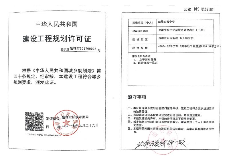 项目简介:楚雄实验中学报审的楚雄实验中学新校区建设项目(一期)修建性详细规划于2017年9月审定实施,其地块位于楚雄市东南新城东升路东侧,规划用地面积76422.519 ㎡,规划总建筑面积48139.72㎡,其中地上建筑面积41589.33㎡,地下建筑面积6550.39㎡,建筑密度13.16%,容积率0.54,绿地率31.18%。2017年9月楚雄实验中学对该项目进行报建,并按程序办理了编号为建字第楚雄市201700023号的《建设工程规划许可证》,建设规模48054.26㎡(其中地下隔震层6550.37㎡),许可内容为:教学楼六栋框架结构地上5层地下1层、连廊一架框架结构地上2层地下1层、行政办公楼一栋框架结构地上6层地下1层、实验楼一栋框架结构地上4层地下1层、学生会堂一栋框架结构地上1层地下1层、图书馆一栋框架结构地上4层地下1层、学生公厕一栋钢架结构地上1层、大门(门卫及安检室)一栋框架结构地上2层。2020年9月楚雄实验中学向我局申请对已竣工建设完成的楚雄实验中学新校区建设项目(一期)进行规划核实验收。经测绘单位实测和现场比对,项目实测总建筑面积为48139.09㎡,容积率0.54,建筑密度13.25%,绿地率16.82%;因建设项目400米跑道标准运动场未按照规划植草实际为塑胶场地,未计入绿地率,实际绿化低于修规确定面积10976.97㎡;公共设施低于修规确定面积158.84㎡;建设项目大门西南侧非机动车停车场未按规划实施并调整为机动车停车区,项目垃圾中转站按建设方承诺纳入实验中学二期统一实施建设。其余建设情况符合《建设工程规划许可证》许可内容,根据《楚雄州建设工程竣工规划验收管理办法》的有关规定特进行公示,如对该项目建设内容规划核实验收有异议的请在公示期限内与我局联系。