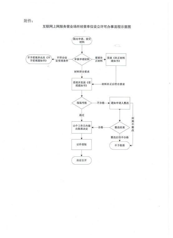 详见附件:互联网上网服务营业场所经营单位设立许可办事流程示意图