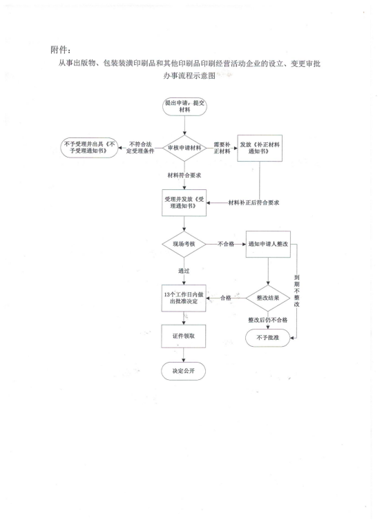 详见附件:从事包装装潢印刷品和其他印刷品印刷经营活动企业的设立、变更许可办事流程示意图
