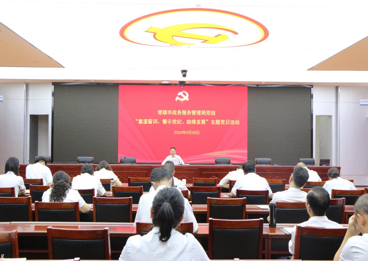 五是讲授一次纪律党课。在“七一”建党节来临之际,依托“三会一课”、主题党日、宣传宣讲等,楚雄市政务服务管理局党组书记、支部书记张汝明同志以“深入学习领会习近平新时代中国特色社会主义思想、党的二十大精神和《中国共产党纪律处分条例》”为主题,为全体党员干部讲授党纪学习教育专题党课。激励广大党员干部带头提高政治站位、带头弘扬奋斗精神、带头贯彻新发展理念、带头坚持以人民为中心、带头树立良好形象,坚决拥护“两个确立”,始终做到“两个维护”。