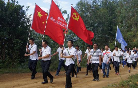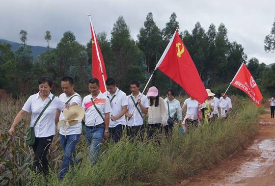 随后,全体人员肩背小挎包,胸前佩戴党员党徽、团徽,在党旗、团旗引领下,追寻红色足迹,重温革命岁月,队伍沿着当年征粮工作队员走过的路径,顺着蜿蜒崎岖的山路,途径冷水箐、兴安寺、王家冲、乌龙寺村,最后到达乌龙湖,体验当年革命先烈征粮时的艰辛和不易。