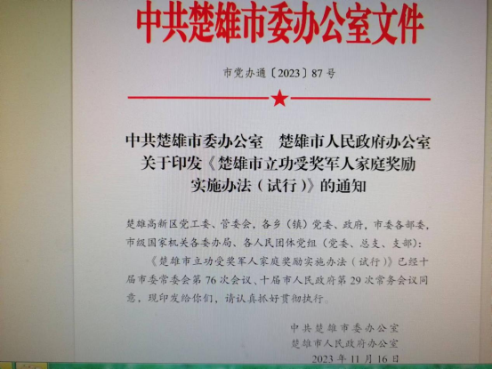 《楚雄市立功受奖现役军人家庭奖励实施办法(试行)》的出台。规范统一了立功受奖军人家庭送喜报工作,不断完善了军人荣誉体系和优抚褒扬政策体系,提升了军人荣誉,持续增强军人和军人家属获得感、幸福感、荣誉感,激励军人投身国防和军队建设,安心部队建功立业,让军人成为全社会尊崇的职业。