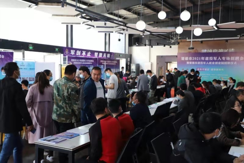 授牌仪式后,楚雄市2021年退役军人专场招聘会线上线下同步举行,在用人单位和退役军人及随军家属之间,搭建起便捷高效的双向选择就业沟通平台。