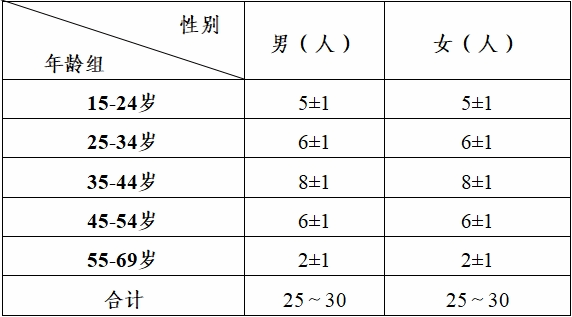 如辖区范围内难再找够前几期未接受过倡导干预的24岁以下和65岁以上人员的社区,可适当减少24岁以下和65岁以上人员倡导干预人数,增加25-64岁年龄段人数,保持总的倡导干预工作量不变。相应的年龄、性别要求如下表:
