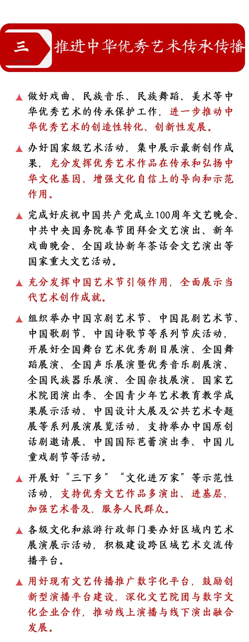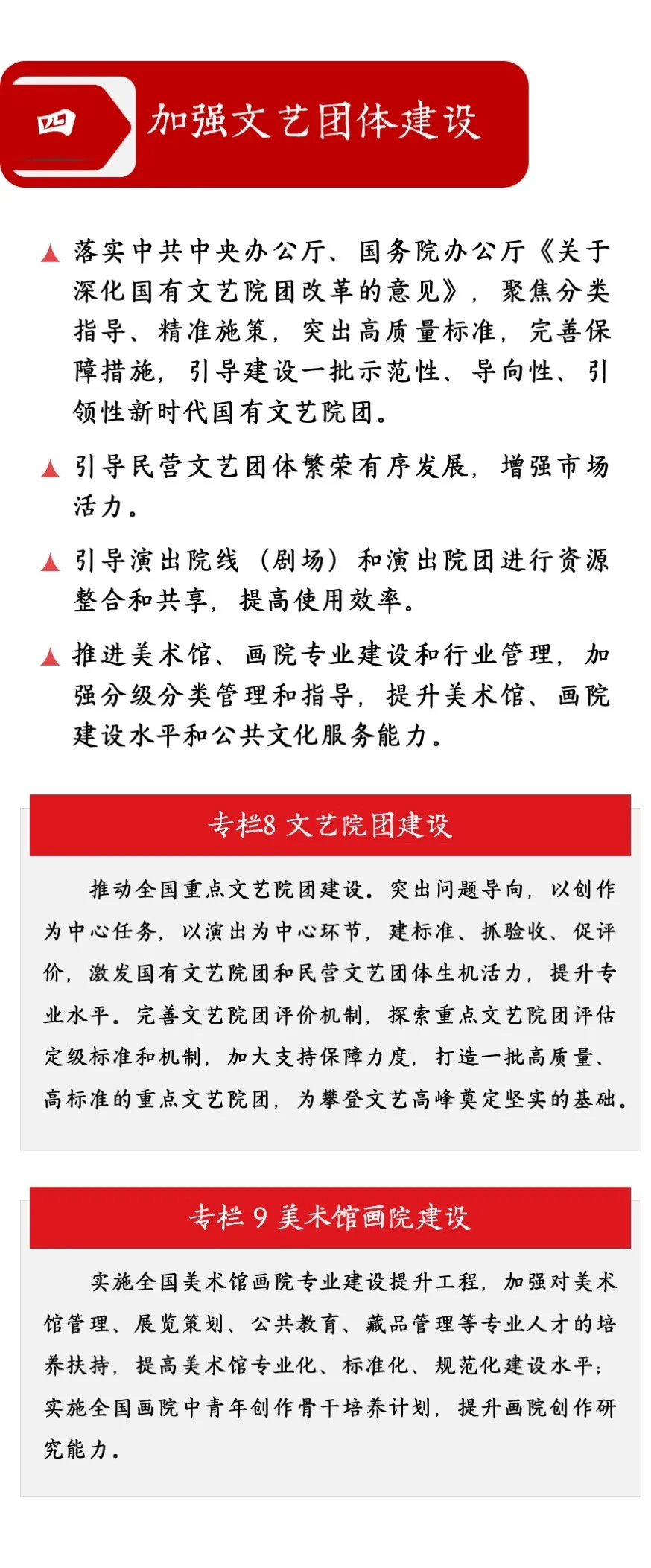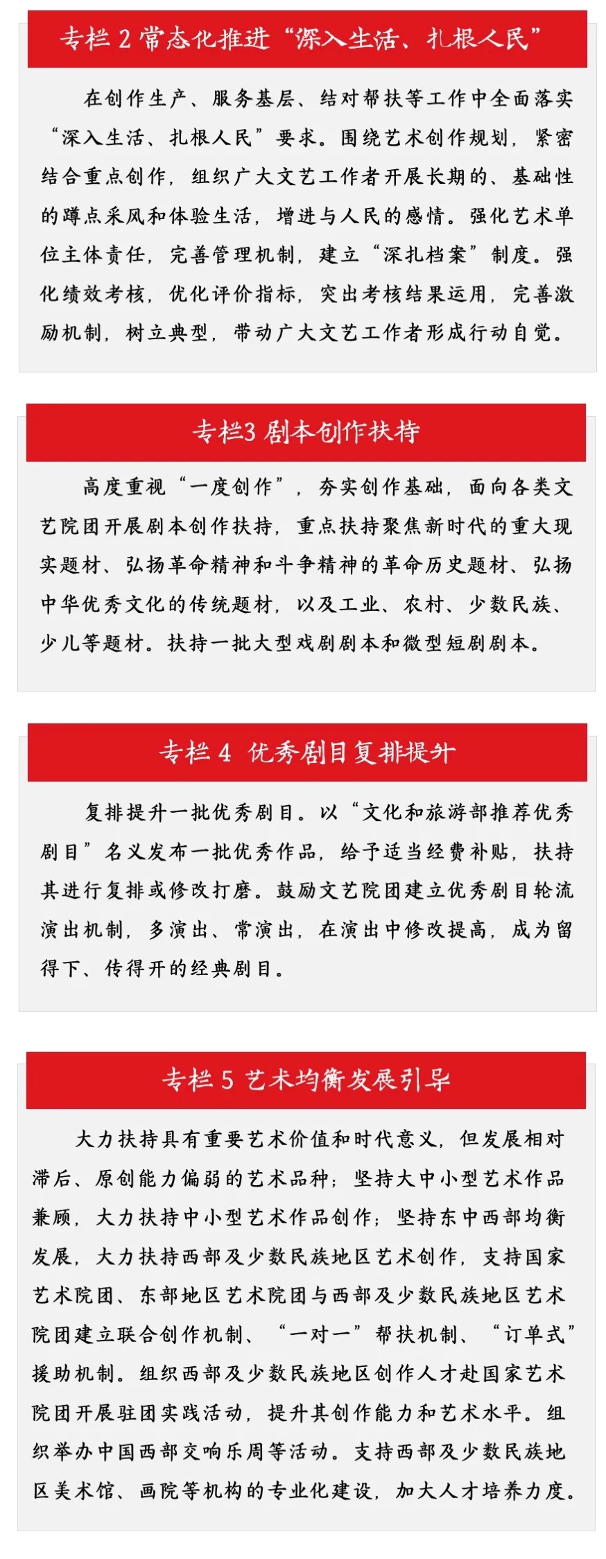 “十三五”以来,在以习近平同志为核心的党中央坚强领导下,在各级党委政府重视支持和社会各界的共同努力下,我国文艺园地百花竞放、硕果累累,呈现出繁荣发展的生动景象。“十三五”时期,一系列重大政策措施相继出台,艺术创作生态进一步改善。文艺战线围绕中心、服务大局,增强“四个意识”、坚定“四个自信”、做到“两个维护”,艺术创作组织化程度进一步提高,艺术作品的整体质量显著提升。重大活动导向和示范作用进一步发挥,文艺人才队伍进一步壮大,艺术传播的广度和深度进一步拓展。在党和人民的各项事业中,文艺事业的重要地位和作用愈加突出。