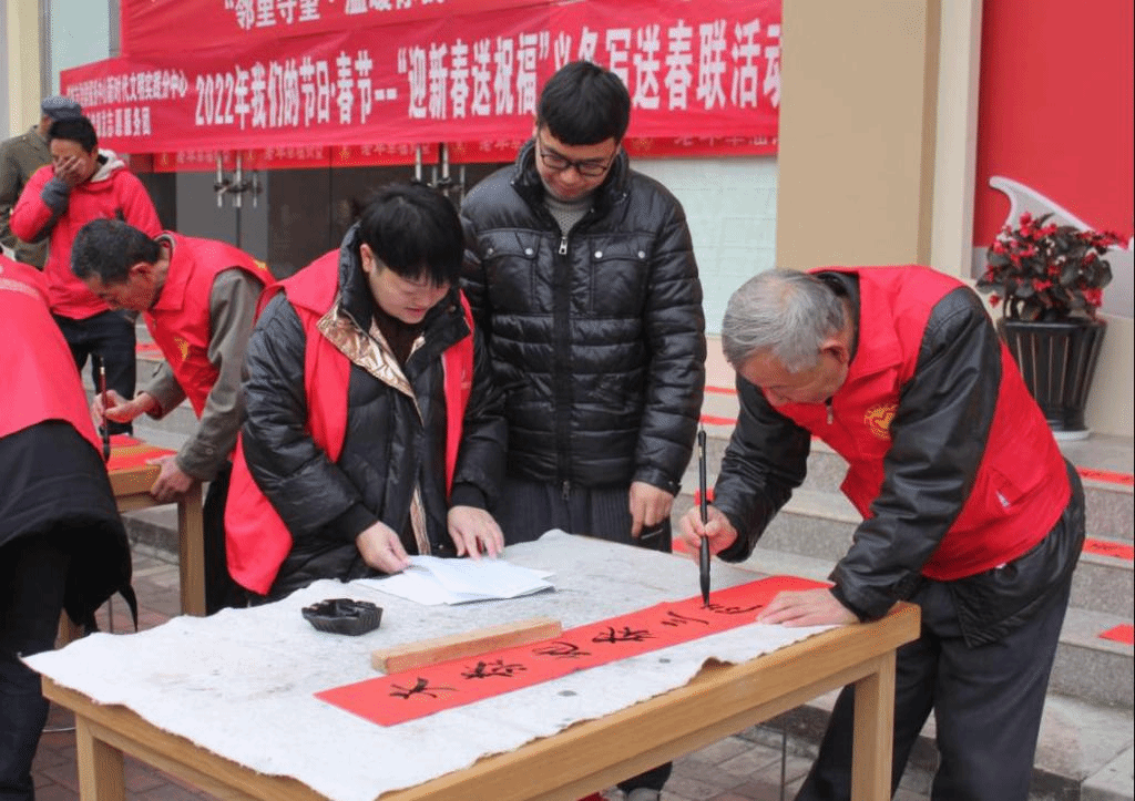 墨香“盛宴”,指尖上的祝福。栗子园社区新时代文明实践站与楚雄市党群服务中心新时代文明实践分中心威楚银发志愿团组织开展2022年我们的节日·春节“迎新春送祝福”义务写春联送春联活动,书法志愿者们欢聚一堂,现场执笔、挥毫泼墨,书写一幅幅年味十足的对联。红红的春联,浓浓的墨香,把浓浓的年味和新春祝福送给社区居民,也为春节增添了喜庆气氛。