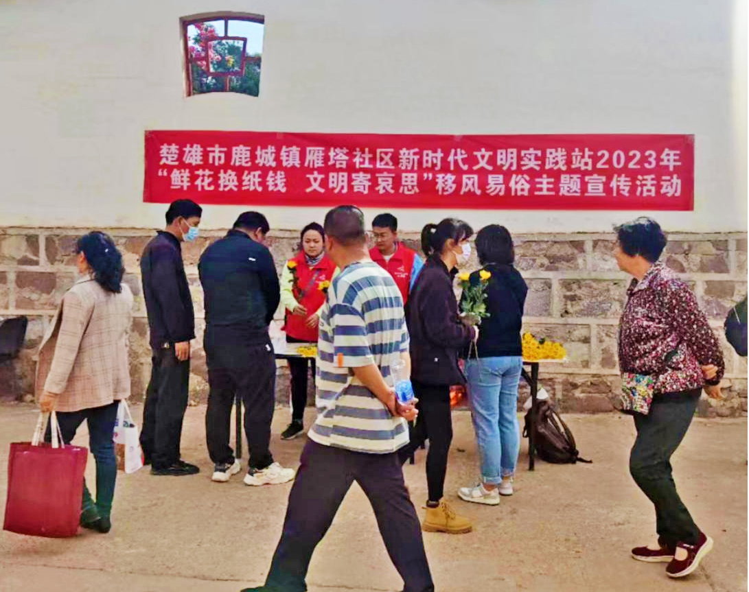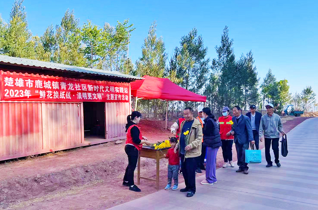又是一年一度清明祭扫高峰来临之际,楚雄市鹿城镇围绕“文明祭祀护林防火”工作,组织志愿服务队25支,在重点路口、坟墓集中区共设立“鲜花换纸钱”兑换点15个,大力开展“鲜花换纸钱”绿色祭扫服务,引导群众文明安全祭扫。