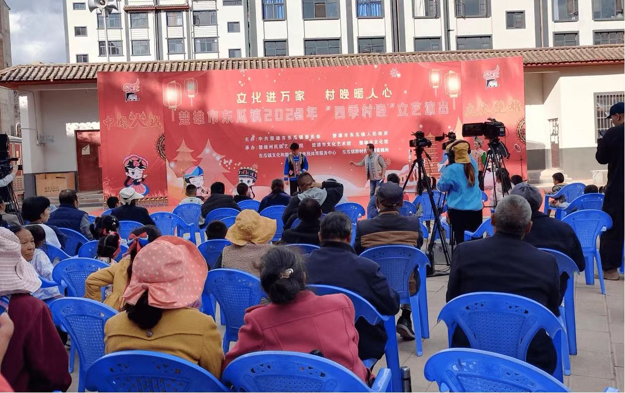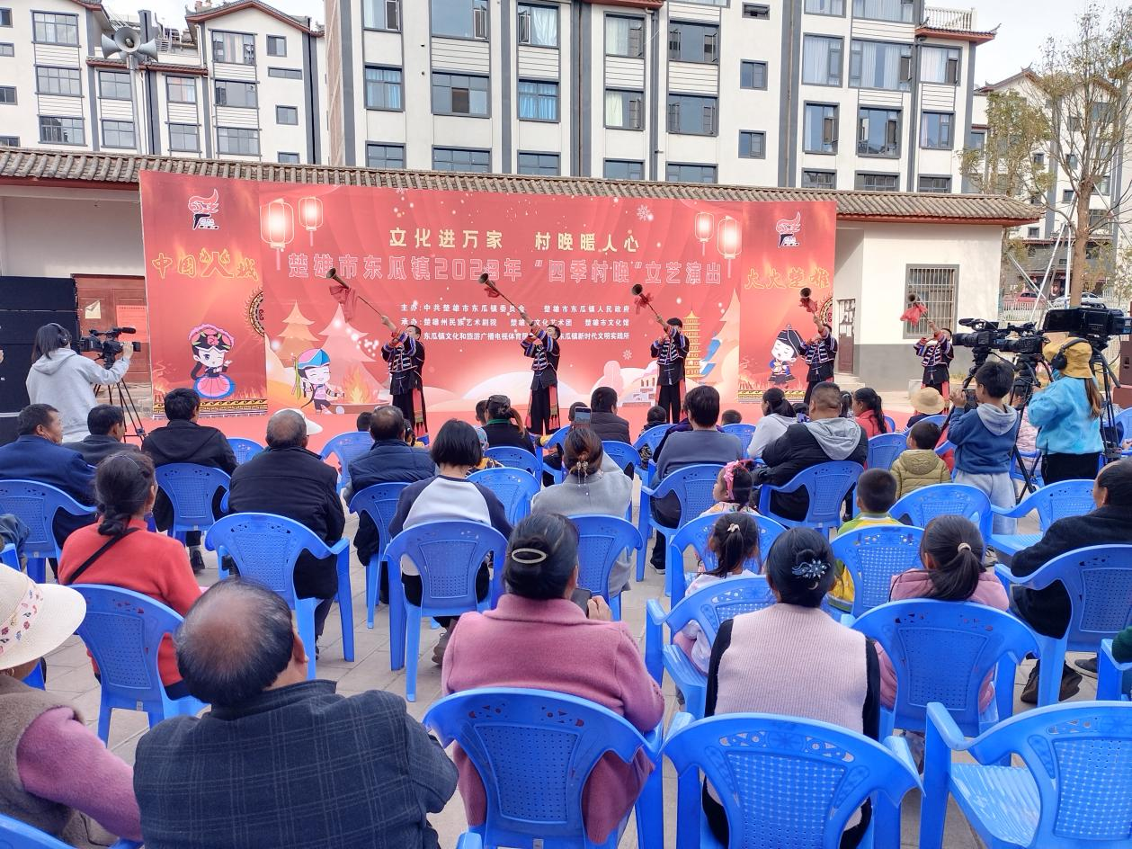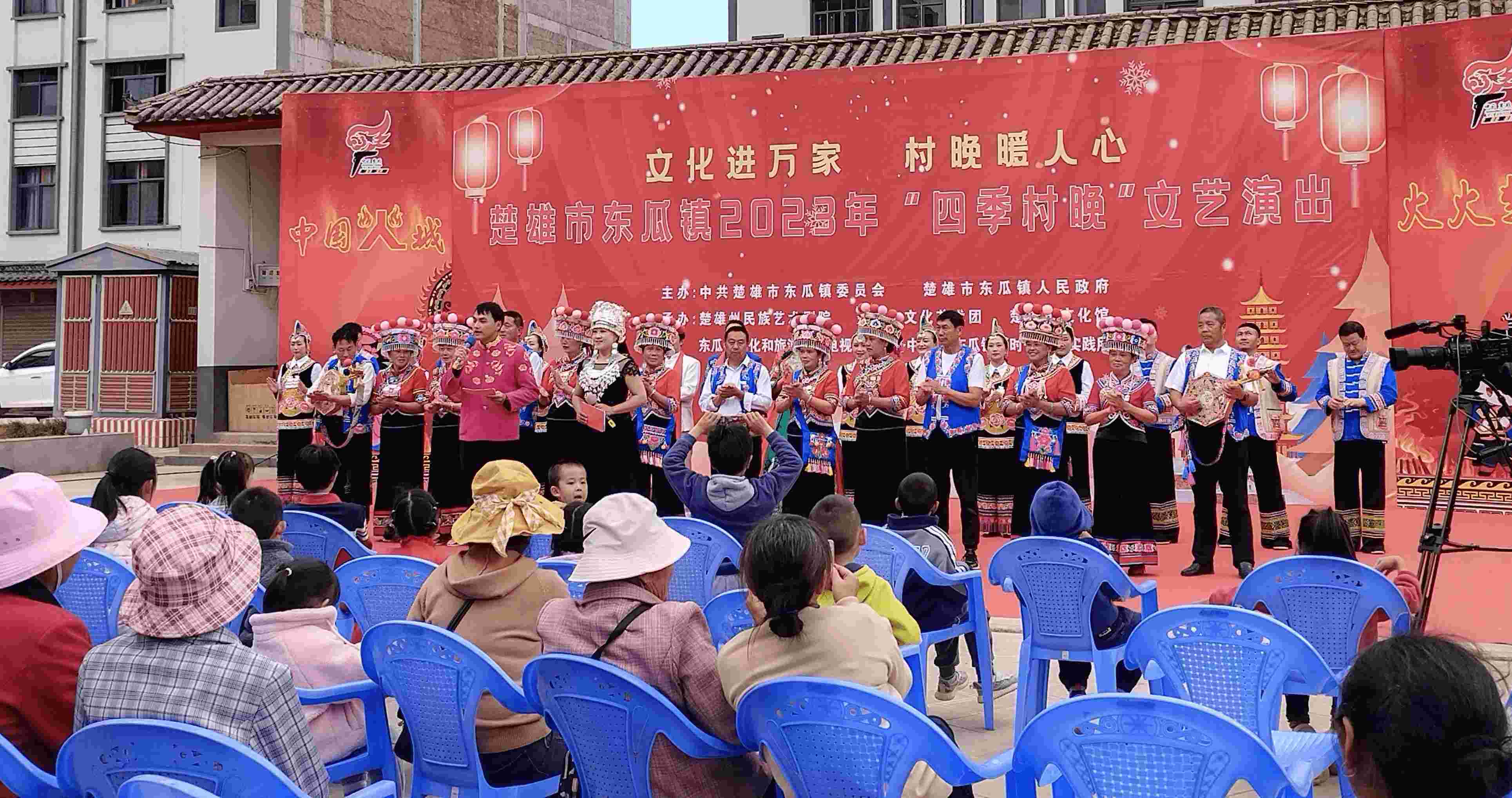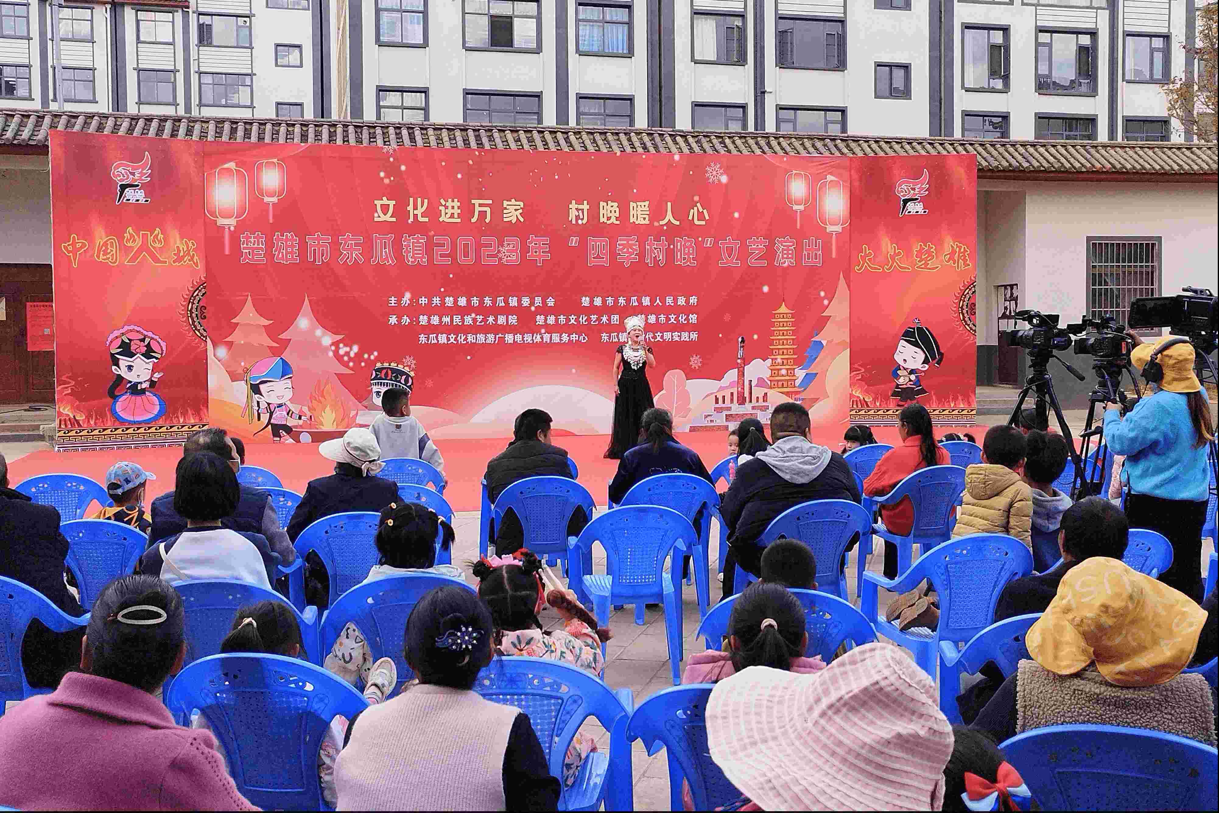为深入贯彻党的二十大精神,全面推进乡村文化振兴,切实满足基层群众文化需求,丰富广大群众业余文化生活,带领大家赏美丽乡村,享乡村振兴,东瓜镇联合楚雄市文化艺术团、桃园社区和辖区优秀业余文化团队于2023年12月2日下午在沙沟安置小区内举办以“文化进万家 村晚暖人心”为主题的“四季村晚”文艺演出。
