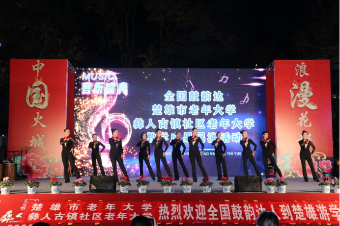 12月20日,彝历新年之际,全国手鼓团队与楚雄州老年大学、楚雄市老年大学、彝人古镇社区老年大学在彝人古镇毕摩广场联袂呈现了教学成果的精彩展演。