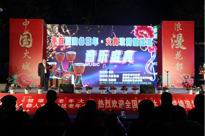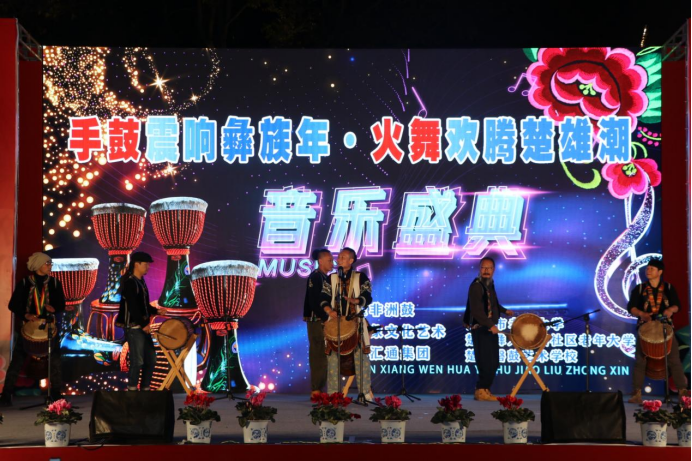 活动在磐鼓艺术培训学校少儿乐队的激情演奏中盛大启幕,来自五湖四海的手鼓团队、老年大学学员、民间歌手等轮番登台,为观众献上了一场精彩绝伦的视听盛宴。鼓印象团队的《赶花街》,楚雄市老年大学的《关关雎鸠》,彝人古镇社区老年大学的《踏歌》,以及彝族歌手绵羊妹妹深情演绎的彝族传统歌曲《云南》《呷尔莫波》,吉木阿华、吉木阿杰与鼓印象阿琳联袂呈现的《我在楚雄等你》等节目,深刻展现了彝族文化的博大精深与独特韵味。