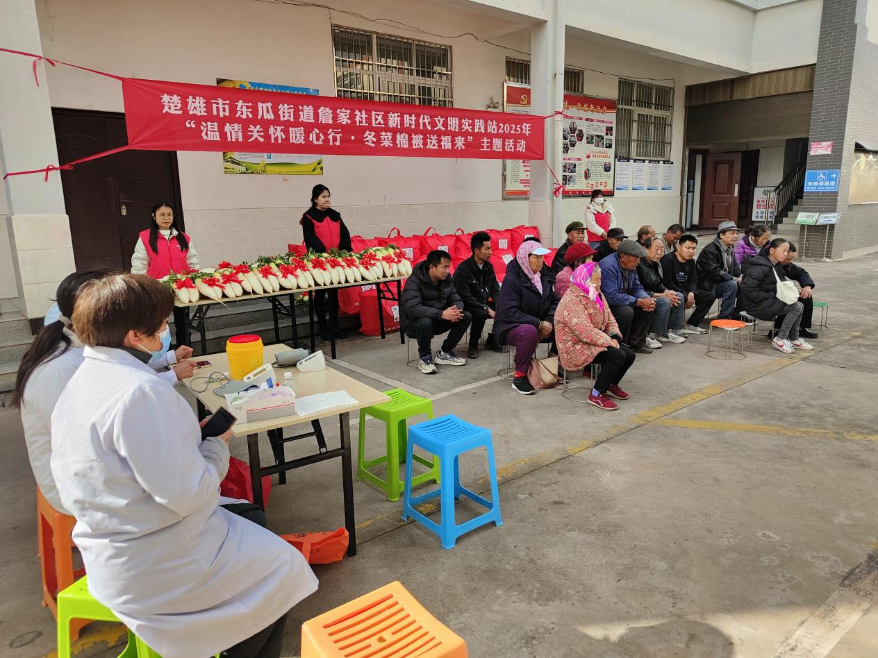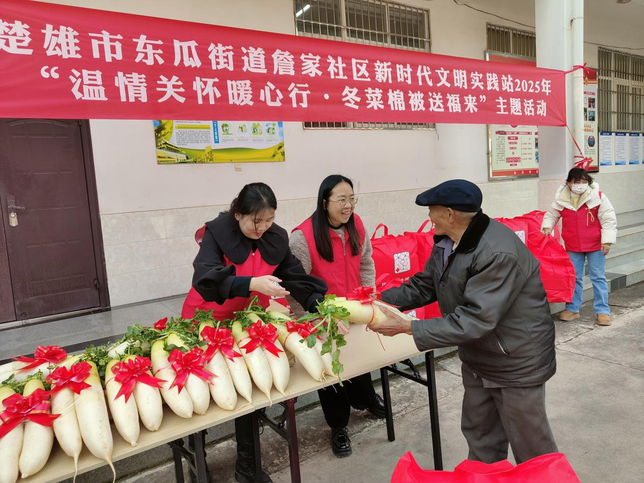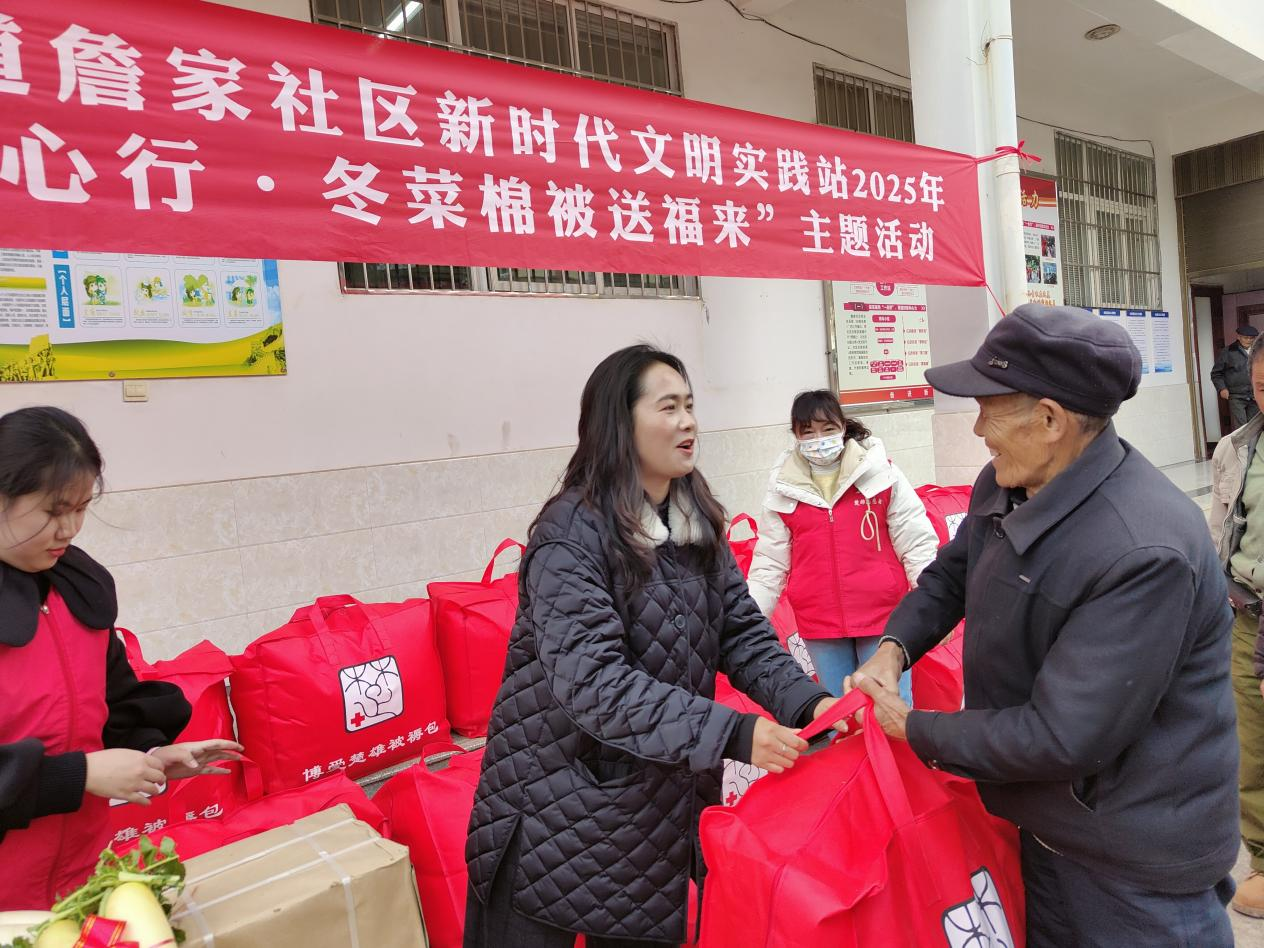 岁寒情暖,温情洋溢。在新春佳节即将来临之际,为让辖区困难群众度过一个欢乐、祥和、温暖的节日,1月9日,詹家社区组织开展“温情关怀暖心行 冬菜棉被送福来”主题活动,提前为困难群众送上冬日温暖和节日的祝福。