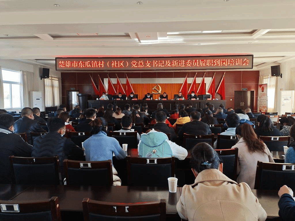 继13个村(社区)总支部委员会换届选举工作圆满收官,为着力提高村(社区)党总支领导班子思想政治素质和服务群众、做群众工作的能力,引导村(社区)党总支班子履职尽责、担当作为,为下步村(居)委换届提供坚强的组织保证,2021年1月4日下午,东瓜镇及时召开村(社区)党总支书记及新进委员履职到岗培训会,市换届指导组副组长盛习文、部分镇党政班子成员、59名村(社区)党总支书记及新进委员参加了会议。