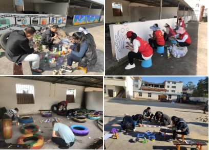 就地取材,扮靓乡村风貌。车坪社区在硬件基础设施改造完成后,集中力量完善朱家村文化设施建设,社区以展现独特乡村魅力、实现差异化发展为目标,组织文化宣传志愿者摒弃动用大量资金、大拆大改的惯例,广泛采取因“户”制宜、就地取材、自己动手,发动广大居民对废旧砖头、瓦片、木料等旧物件进行再利用,变废为宝。运用各色颜料涂染轮胎、画瓦片、画墙体,利用废旧木头外层涂色,切面制作花朵、灯笼等物品点缀,同时结合朱家村竹子多的优势,编织竹扇等装饰品,为美丽乡村增加色彩感和文化感。