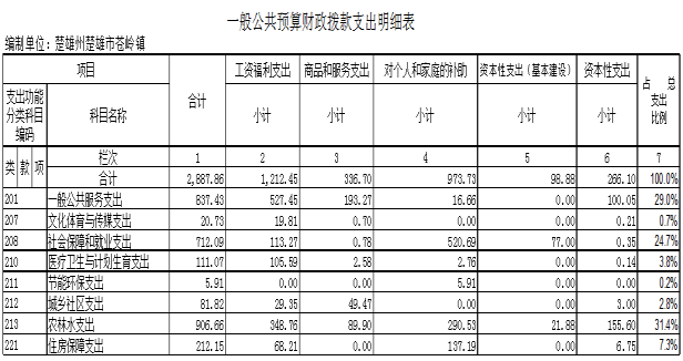 苍岭镇2018年度一般公共预算财政拨款支出2887.86万元,占本年支出合计的97%。是上年2780.65万元的104%,主要原因是上年财政结转数186.74万元今年实施支付,今年财政结转数86.2万元。
