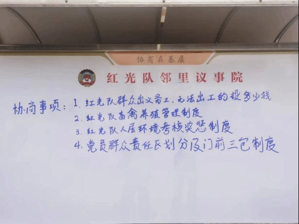 “每家投5个义务工,我也同意呢。”群众代表周家明说。“确定这两条路为牲畜上山放养的路”党员代表罗启顺举手赞成......在苍岭镇黄草村委会红光队村民小组,一场由党员代表、人大代表、政协委员、群众代表、少数民族代表组成的协商议事会正在热烈讨论着。大家围绕农村人居环境如何形成长效管理制度?门前三包制度和党员责任区如何划分?投工投资要投多少?奖惩制度如何定?等4个问题进行协商议事,最终形成协商议事决议,共同制定了《红光队垃圾清运收费制度》《红光队牲畜家禽管理制度》《红光队义务劳动奖惩制度》《红光队“五颗星”评选制度》等办法,随后,镇委员联络处通过发出《苍岭镇政协委员联络处协商成果转化督办书》、场跟踪督办、入户走访征求意见等形式,有力督促协商成果转化,真正做到了“小协商”助力“大民生”,这样的议事会议受到群众的广泛好评,红光村村民一致表示今后这样的协商希望能够多开展。议出的制度和村规民约让群众更能接受,更加自觉执行。