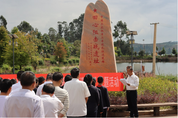 活动开始,全体人员在田心阻击战纪念碑前整齐列队、全场肃立,奏唱中华人民共和国国歌,向烈士默哀。随后,镇党委委员向全体人员讲解了烈士纪念日及楚雄人民抗日的相关历史知识,用楚雄人民参加抗日战争、苍岭田心阻击战、苍岭革命先驱等红色故事,颂扬英烈精神、优良作风和红色传统,凝聚奋斗新时代、奋进新征程的精神动力。