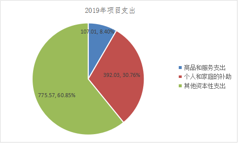 2019年度用于保障吕合镇机关事业单位为完成特定的行政工作任务或事业发展目标,用于专项业务工作的经费支出1274.62万元。与上年对比,2018年项目支出1141.8万元,同比增长11.63%。增长的主要原因是2019年度危房改造补助项目资金增加,各类扶贫项目资金增加,项目支出增加。包括商品和服务支出107.01万元占比8.4%,对个人和家庭的补助392.03万元占比30.75%,资本性支出775.57万元占比60.85%。
