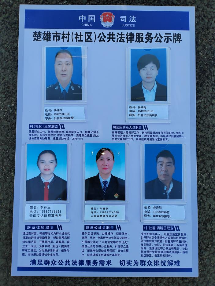 健全组织体系,法律顾问下沉村组。吕合镇认真贯彻落实律师联系乡镇、村(社区)工作制度,制作《楚雄市村(社区)公共法律服务公示牌》,对村(社区)民警、司法所工作人员、律所律师、公证员、村调解员的服务职能信息进行公示,并利用村民小组会议、党员会议等方式,加大宣传,提高群众知晓率,为群众提供方便。