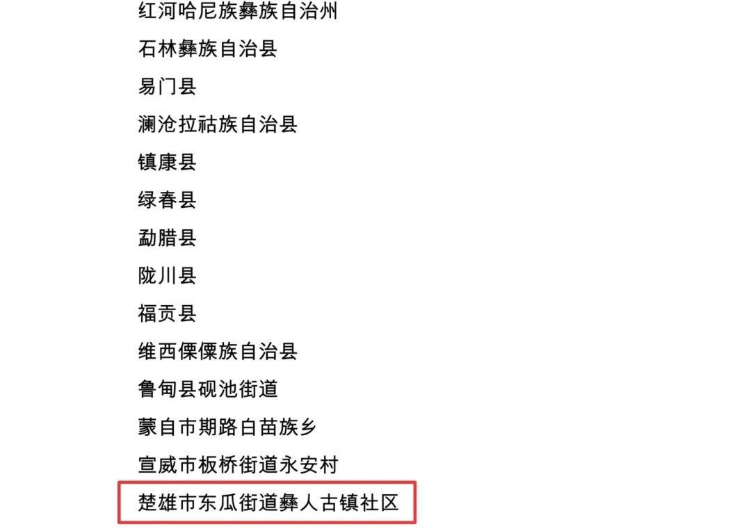2026年1月29日,国家民族事务委员会发布了《国家民委关于命名第十二批全国民族团结进步示范区示范单位的决定》,楚雄市东瓜街道彝人古镇社区被命名为第十二批全国民族团结进步示范单位。