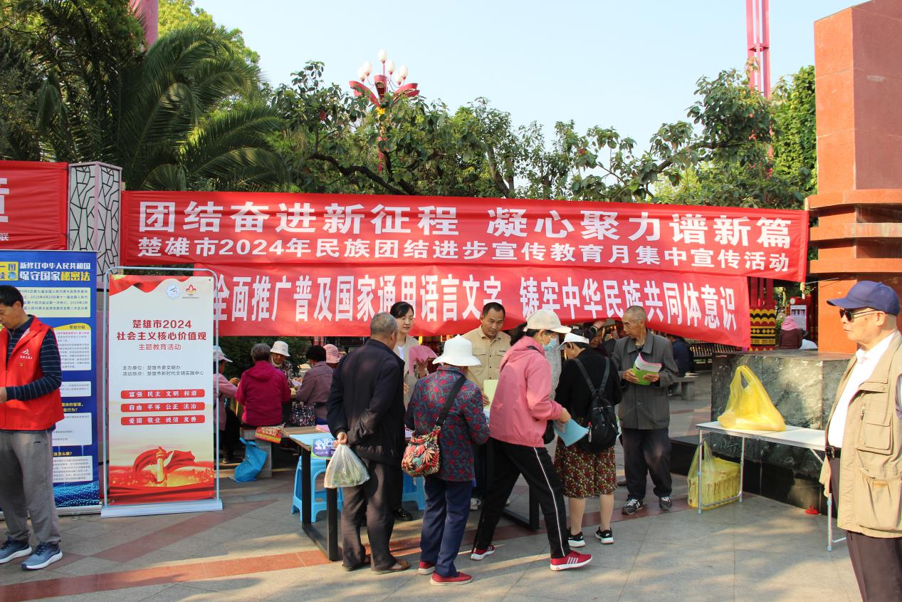 4月10日,楚雄市在桃园湖广场开展2024年民族团结进步宣传月活动,旨在深化民族团结进步教育,进一步铸牢中华民族共同体意识。