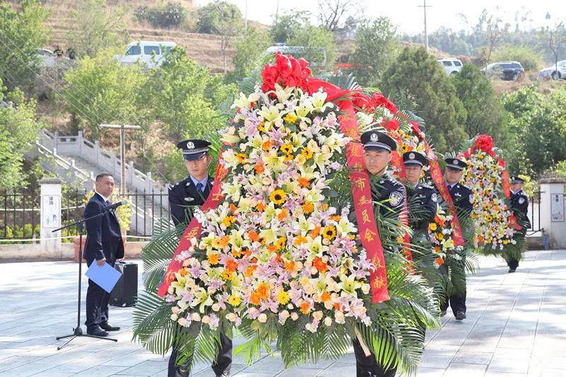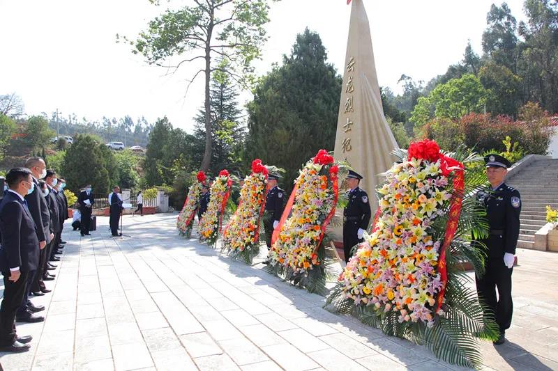 伴随着深情的乐曲,礼兵托起由中共楚雄市委、市人大常委会、市政府、市政协、楚雄高新区党委管委敬献的花篮,正步走向烈士纪念碑,将花篮摆放在纪念碑前。市委副书记、市长杨俐昆缓步向前,整理花篮缎带。全体人员庄重地三鞠躬,表达对革命烈士的深切缅怀和无限敬仰。