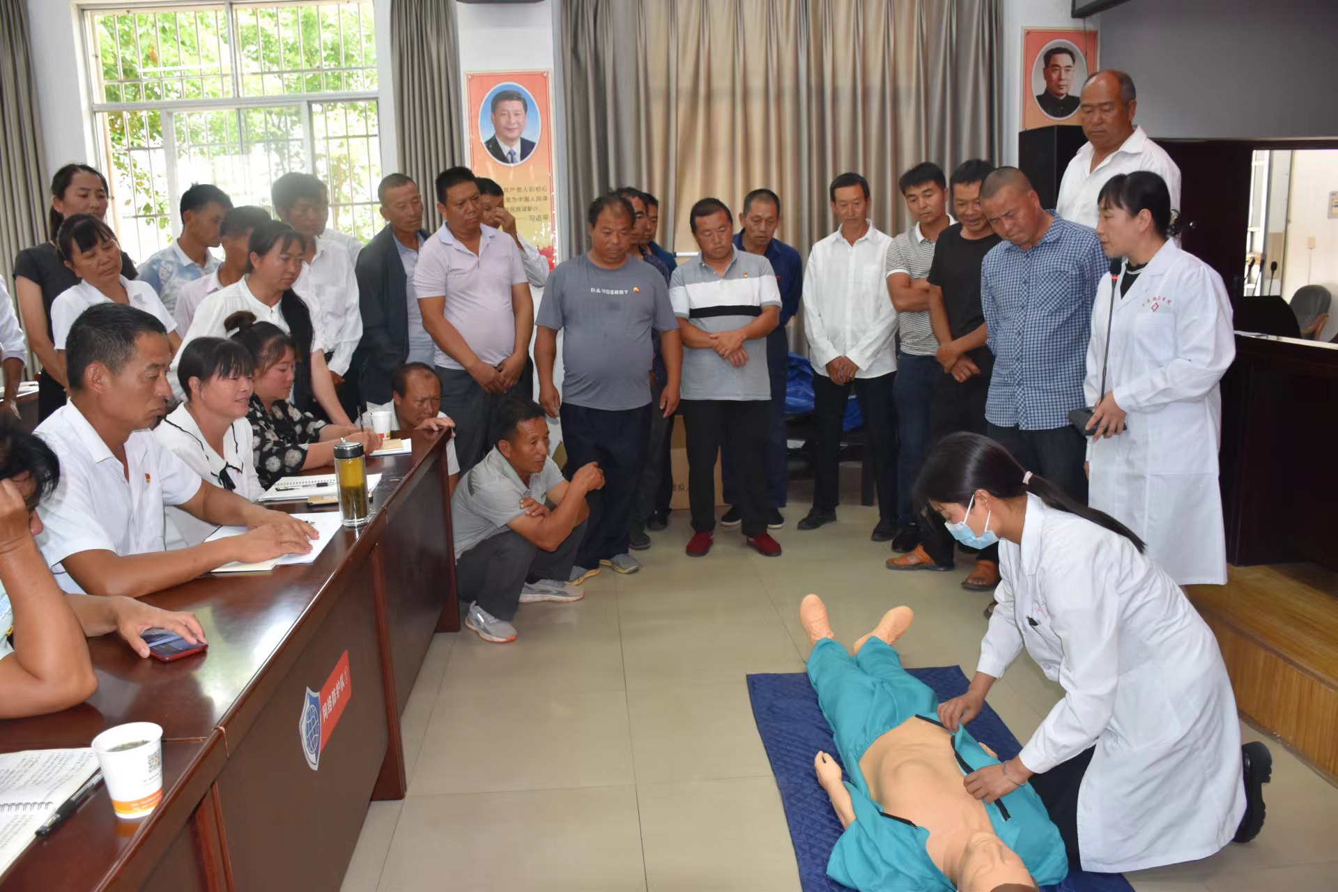 在培训中,卫生院的医护人员结合日常生活中的突发事件,以生动的语言、真实的案例,分别就急救的重要性、急救的基础知识、心肺复苏术等进行讲解,对如何在事故发生第一时间的“黄金4分钟”内采取正确、有效的应急措施作了详尽教学,并现场利用人体模型演示胸外心脏按压、人工呼吸、AED使用等急救技能。大家听得认真、学得仔细,纷纷表示受益匪浅。