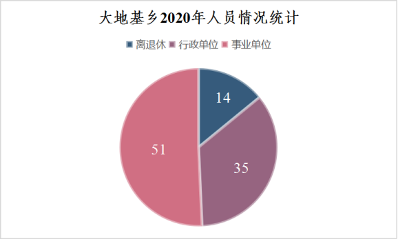 大地基乡2020年末实有人员编制75人。其中:行政编制32人(含行政工勤编制0人),事业编制43人(含参公管理事业编制4人);在职在编实有行政人员25人(含行政工勤人员7人),事业人员36人(含参公管理事业人员1人)。