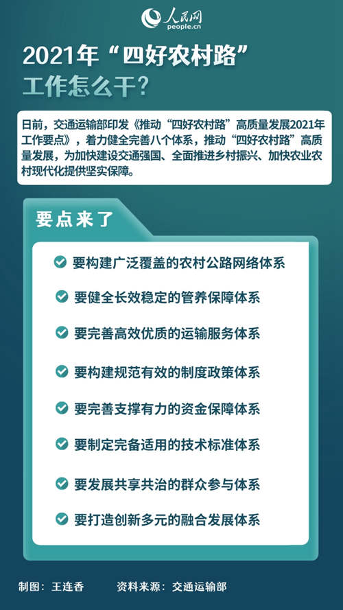 据交通运输部消息,日前,交通运输部印发《推动“四好农村路”高质量发展2021年工作要点》,着力健全完善八个体系,推动“四好农村路”高质量发展,为加快建设交通强国、全面推进乡村振兴、加快农业农村现代化提供坚实保障。