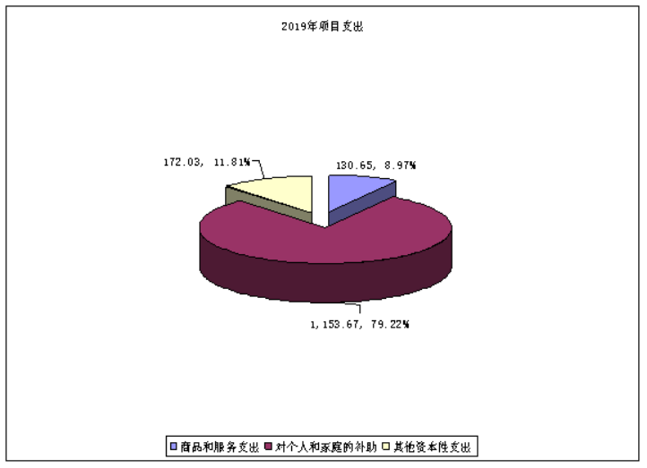2019年度用于保障新村镇机关事业单位为完成特定的行政工作任务或事业发展目标,用于专项业务工作的经费支出1456.35万元。与上年对比,2018年项目支出938.86万元,同比增加55.12%。增加主要原因是2019年度危房改造补助项目资金增加,各类扶贫项目资金增加,项目支出增加。包括商品和服务支出130.65万元占比8.97%,对个人和家庭的补助1153.67万元占比79.22%,资本性支出172.03万元占比11.81%。