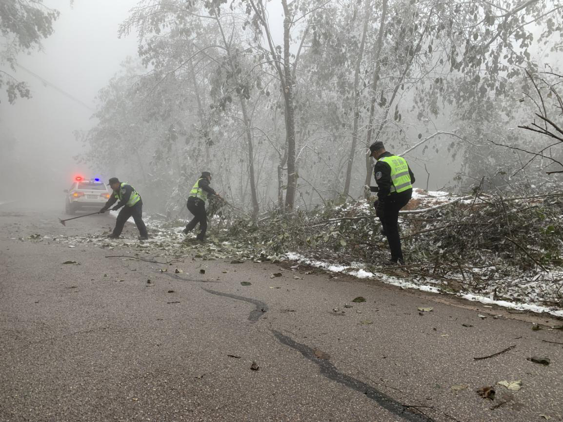 ——加强路面巡逻,加大整治力度。受强降雨降雪天气影响,新村镇辖区部分道路结冰、积雪严重,大雪压弯东大线、新鄂线等道路两侧树木,部分枝干无法承重压到公路上,导致道路路段无法通行,新村镇高度重视,派出应急工作专班,采取定点检查宣传、流动巡逻执勤相结合的方式上路开展巡逻清障“治危保畅”工作。新村派出所民警开警车、亮警灯、响警笛开展辖区危险路段巡逻清理管控,竭力迅速清理整治道路落石、雨雪压倒的树木、积雪等,积极劝导过往车辆驾驶员安全行驶,非必要不出行,畅通了辖区各条道路交通线,保障全镇道路交通环境安全。