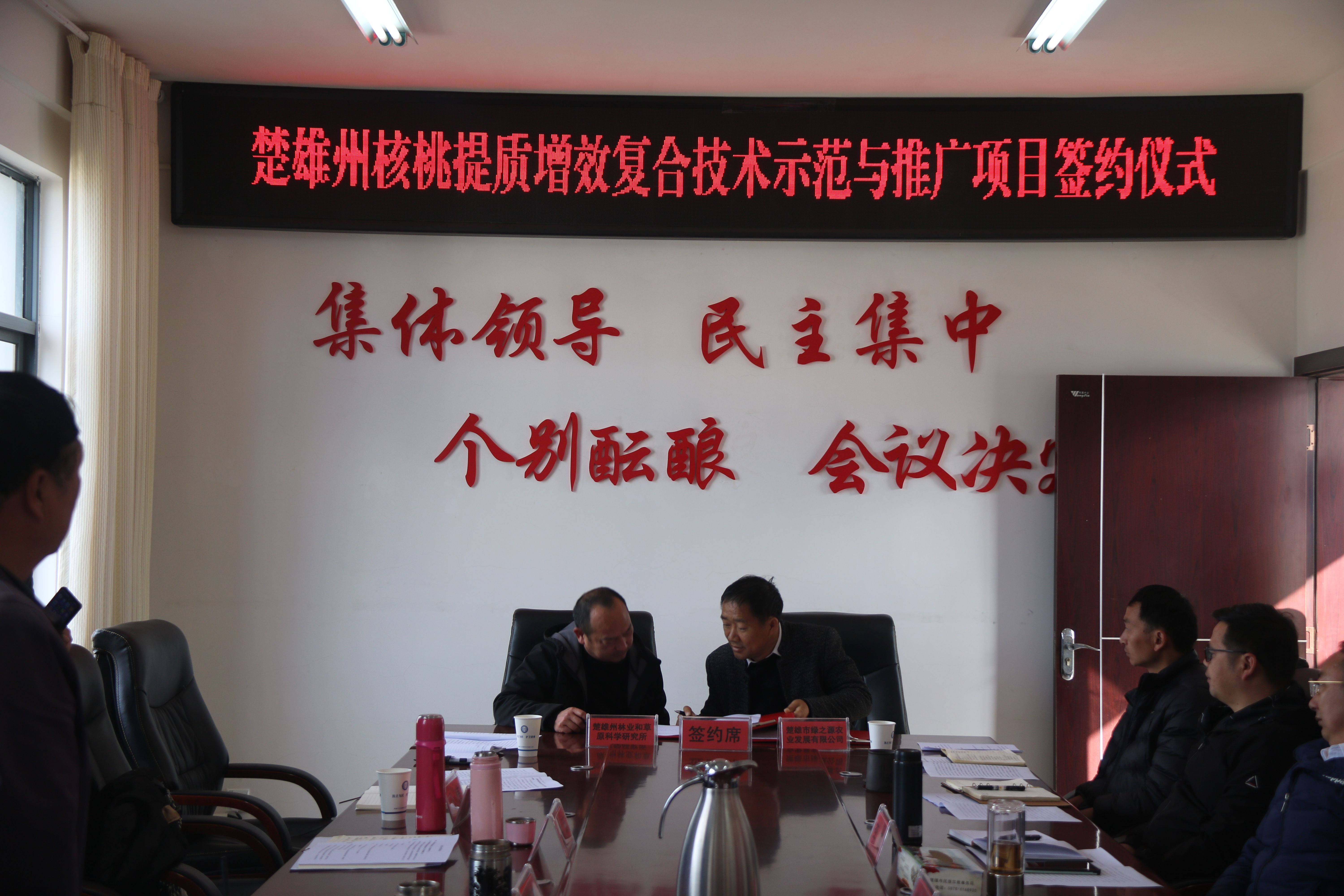 签约仪式上,在各位专家、领导的见证下,云南省林业和草原科学院、楚雄州林业和草原科学研究所同新村镇核桃产业龙头企业绿之源农业发展有限公司,进行楚雄州核桃提质增效复合技术示范与推广暨云南基层专家工作站项目签约。