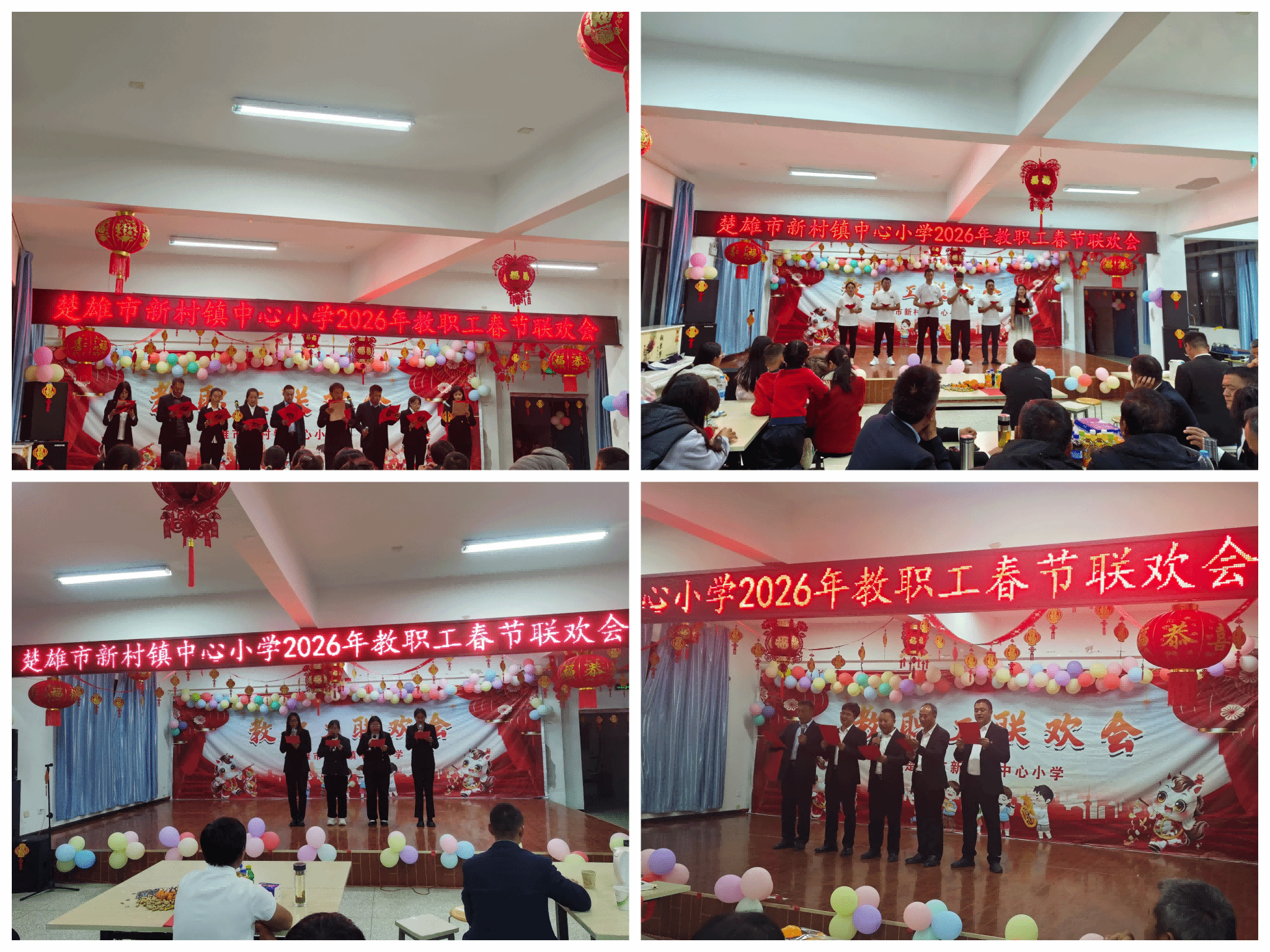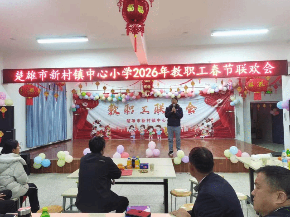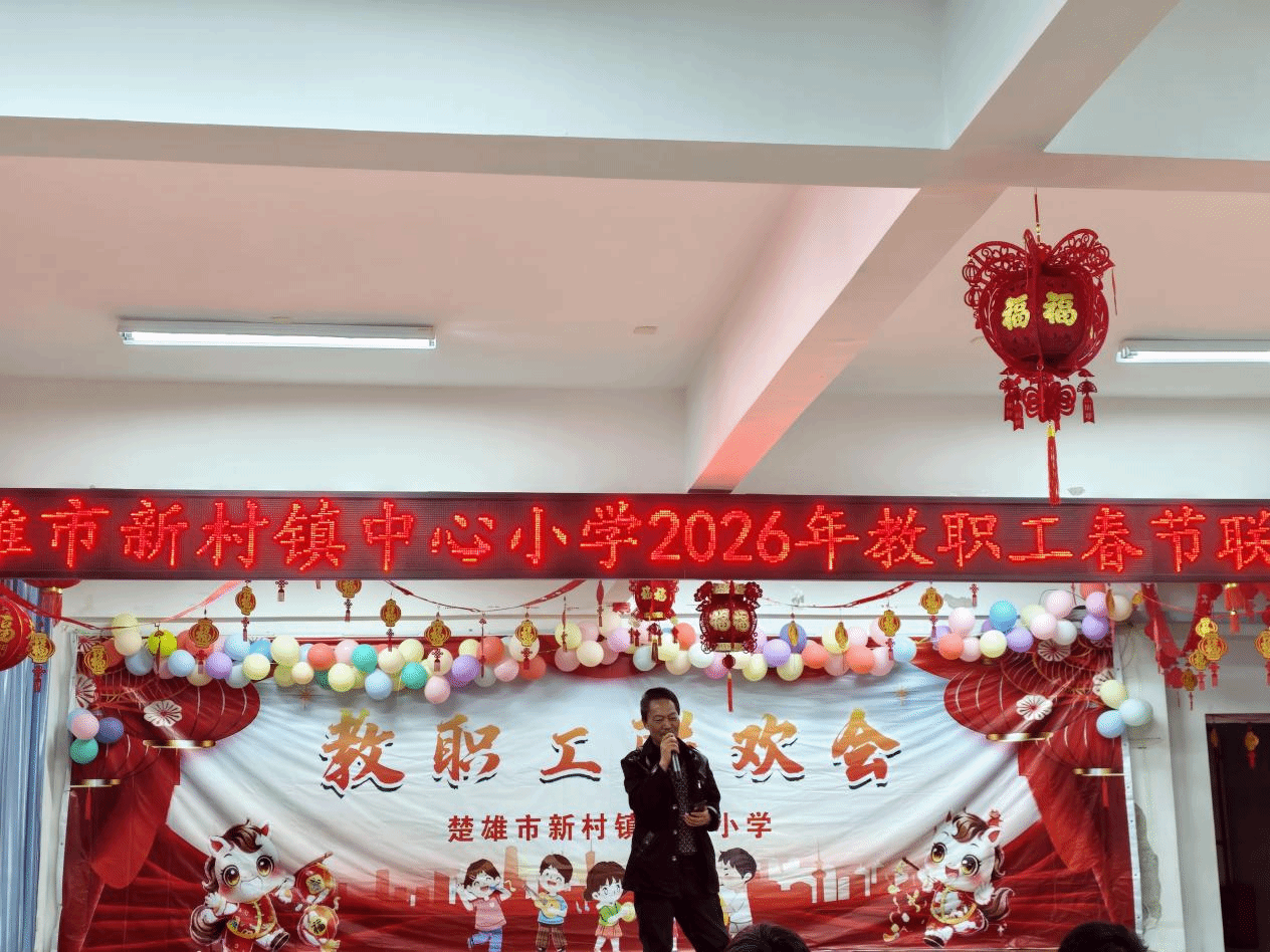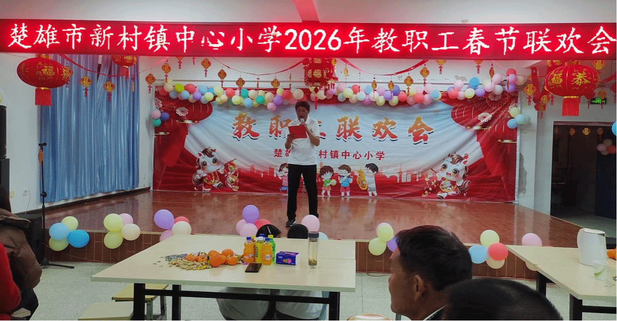 红灯笼裹满甜,暂别红笔赴团圆。一学期的忙碌刚歇,阅卷的红墨尚未升温,相逢的欢喜已满盈!新村镇中心小学的活动室已被红绸与灯笼织成暖巢:LED屏亮着“2026教职工春节联欢会”的红字,彩气球顺着背景板垂成缤纷的帘,连桌上的橘子与花生,都裹着新春的甜香。刚从试卷堆里抬头的老师们,笑着卸下沉甸甸的红笔,转身就撞进这场“专属团圆”的“家人宴”里。