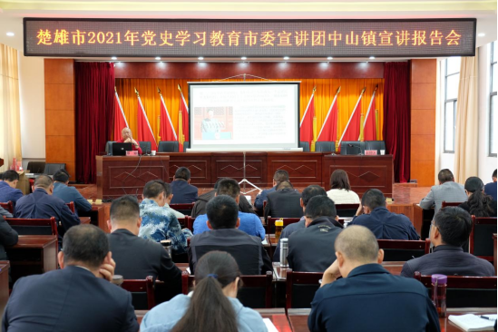 为深入学习贯彻中央和省、州、市党史学习教育动员大会精神,广泛营造“学党史、悟思想、办实事、开新局”浓厚氛围,推动党史学习教育各项工作扎实开展,以优异成绩庆祝建党100周年,6月11日上午,楚雄市委党史学习教育宣讲团赴中山镇召开宣讲报告会,镇党政班子成员、镇全体干部职工、市属站所负责人、11个村党总支书记、村委会主任、第一书记,共100余人参加了报告会。