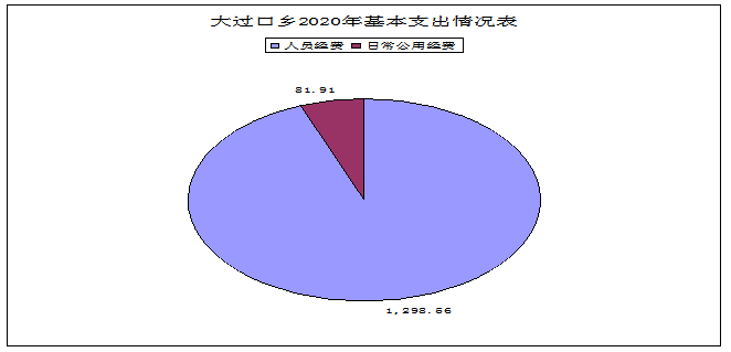 2020年度用于保障楚雄州楚雄市大过口乡机关、下属事业单位等机构正常运转的日常支出1380.47元。与上年对比减少15.29万元,主要原因是上级财政资金紧张,公用经费未下达完。包括基本工资、津贴补贴等人员经费支出占基本支出的94.07%;办公费、印刷费、水电费、办公设备购置等日常公用经费占基本支出的5.93%。
