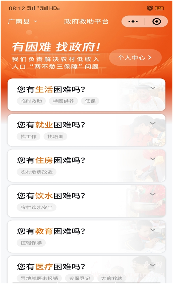 该平台目前共设置“生活困难、就业困难、住房困难、饮水困难、教育困难、医疗困难”6个板块,涉及市民政局、市人力资源和社会保障局、市住房和城乡建设局、市水务局、市教育体育局、市卫生健康局、市医疗保障局7个行业部门,包括“临时救助、特困供养、低保、找工作、找培训、农村危房改造、农村饮水安全、控辍保学、卫生医疗机构查询、慢病健康管理、大病专项救治、居民医疗参保登记、异地就医费用报销、大病救助、看病预约”15个申报服务事项。