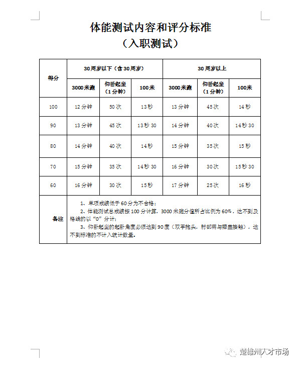 (2)体能测试成绩为100分,测试科目为100米跑、3000米跑、俯卧撑。3000米跑为必测科目,所占分值为60分;其它两项任选一项,所占分值为40分,考核达标标准见附件2。