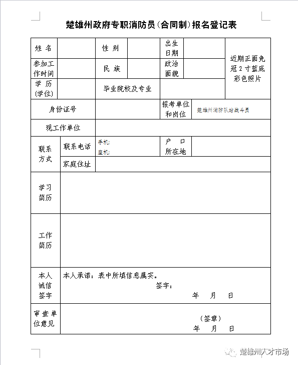 (1)填写完整准确、提供纸质手写版《楚雄州政府专职消防员(合同制)报名登记表》一份,如实填写工作简历,本人在诚信承诺栏中签字,同时携带个人近期免冠2寸蓝底照片3张。